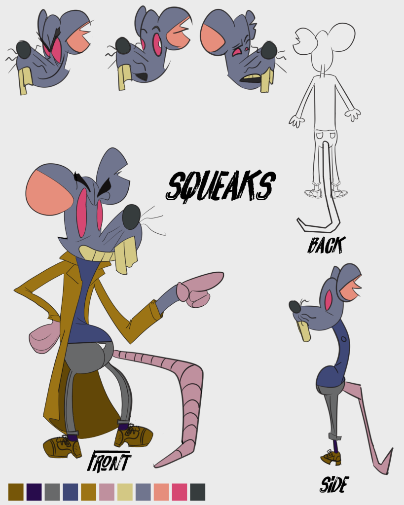I went for a hybrid of tattered ears not forgetting he’s a rat, while having his outfit being inspired by the Mod Squad.